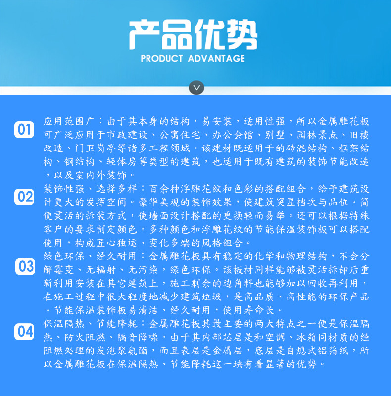 金属雕花板厂家山东金铠建筑材料有限公司是一家坚持以科技创新为目标,以新型保温复合材料为主,瞄准国际、国内市场,集科、工、贸于一体的综合性公司。