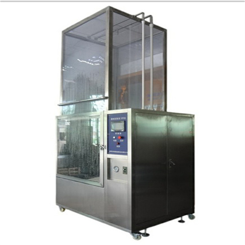 防水材料拉伸试验机也称防水试验,由于不同的水量与环境影响产品的质量也不同,所以标准里把IP防水等级做了详细的等级划分。而IPX5、IPX6淋雨试验箱、防水试验室则是因为拥有相同及累似的一些条件,所以它们可以在同一套硬件设备里完成此两个等级的试验。先说说它们的等级要求的相同点与不同点,一:均是要求喷水试验,不同的IPX6要求是强烈喷水试验。二:使试验样品至喷水口相距为2.5~3m,而IPX5要求水流量为12.5L/min (750L/h),IPX6则要求水流量为100L/min(6000L/h)。三:IPX5的喷嘴的喷水口内径要求为6.3mm;而IPX6喷嘴的喷水口内径则要求为12.5 mm 。从以上特点可以看出,它们对使试验样品至喷水口相距为2.5~3m是相同的高度,只要求水流量及喷水口内径不同而已,那么我们则同一台箱室上面安装2个喷水头,其中IP5喷头1个,IP6喷头1个即可。