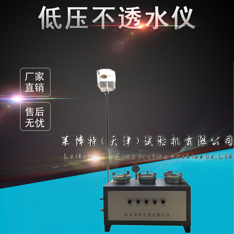 检测石油沥青油毡及弹性全沥青防水卷材的不透水性的仪器,可满足GB/328所规定的试验要求。本仪器采用电动泵加压,电器自动控制加气加压,自动保持压力,数显计时,在测试压力不大于0.6Mpa的情况下,可以用本仪器作其它有关材料透气性或透水性的测定。