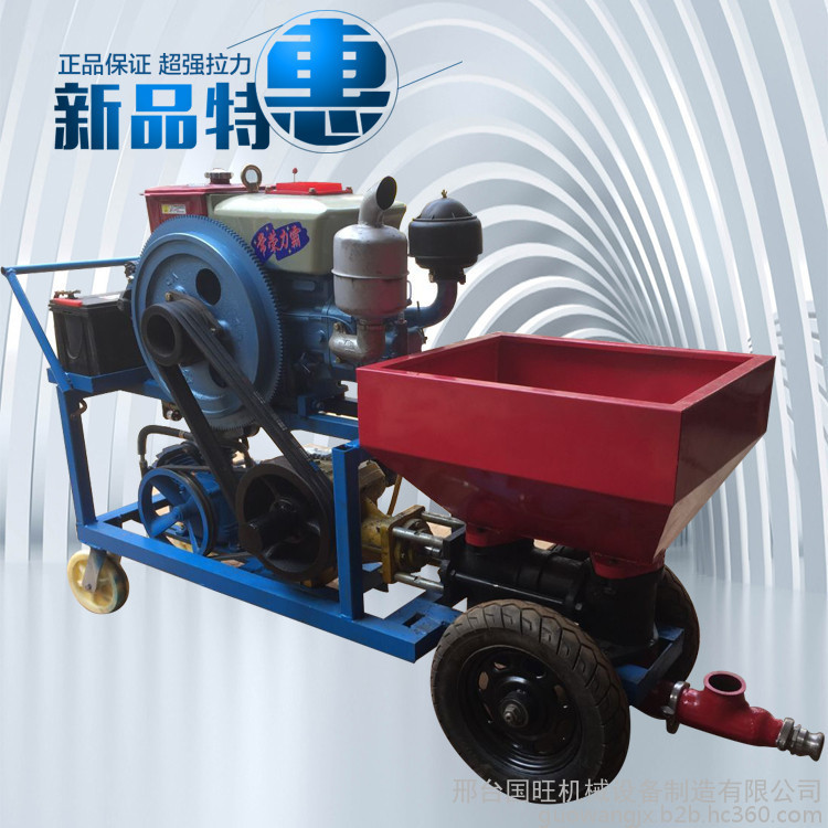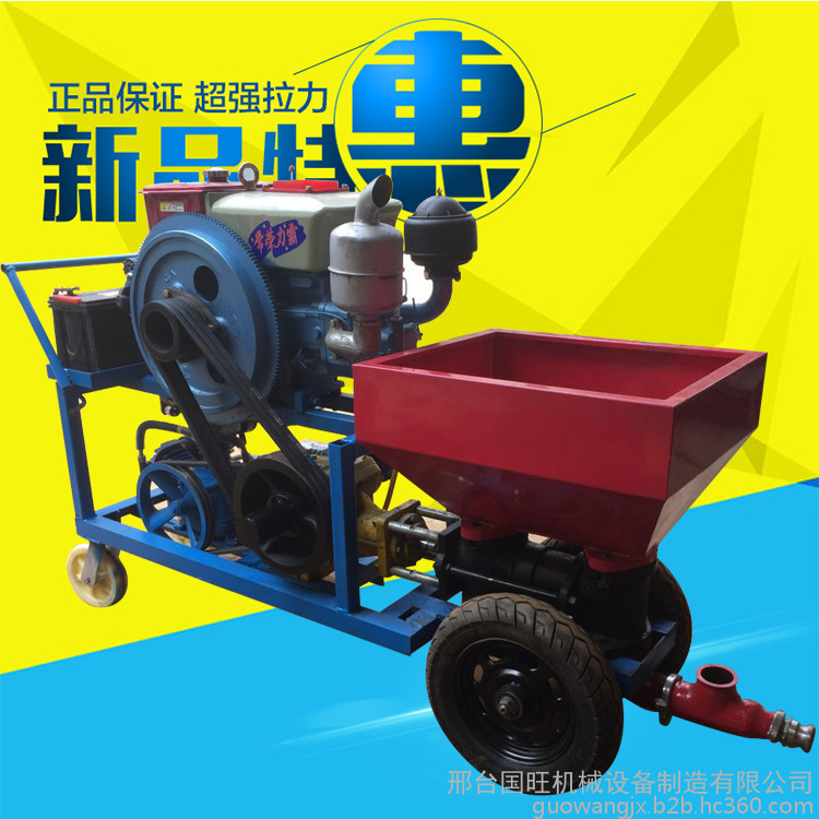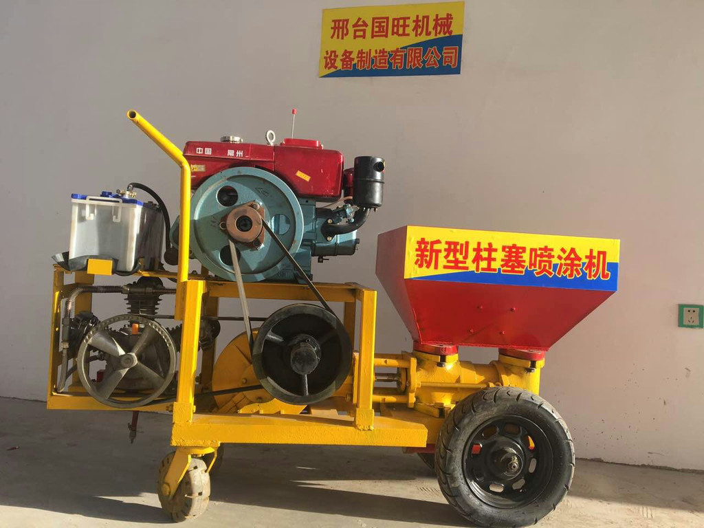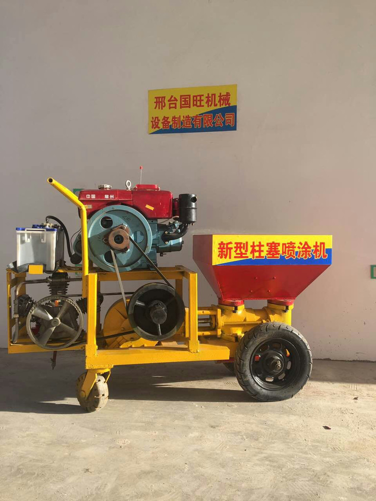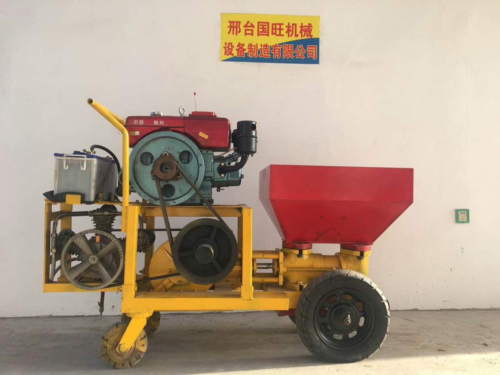 9、国旺公司生产的柴油砂浆喷涂机基本没有落地灰、省水、省料,可大降低成本,操作简单,无需搭脚手架,不用移动设备,不用修补搭茬,阴阳角、顶板均能自由喷涂,具有速度快,效率高,劳动强度低。
