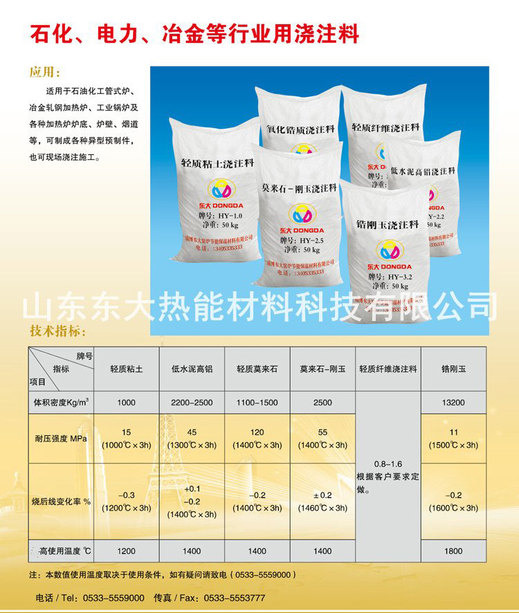 我公司年产耐火、耐磨、耐酸、高铝、高强、高温胶泥、高温粘合剂等浇注料10000余吨,并可根据客户的需求研究和开发新的产品。