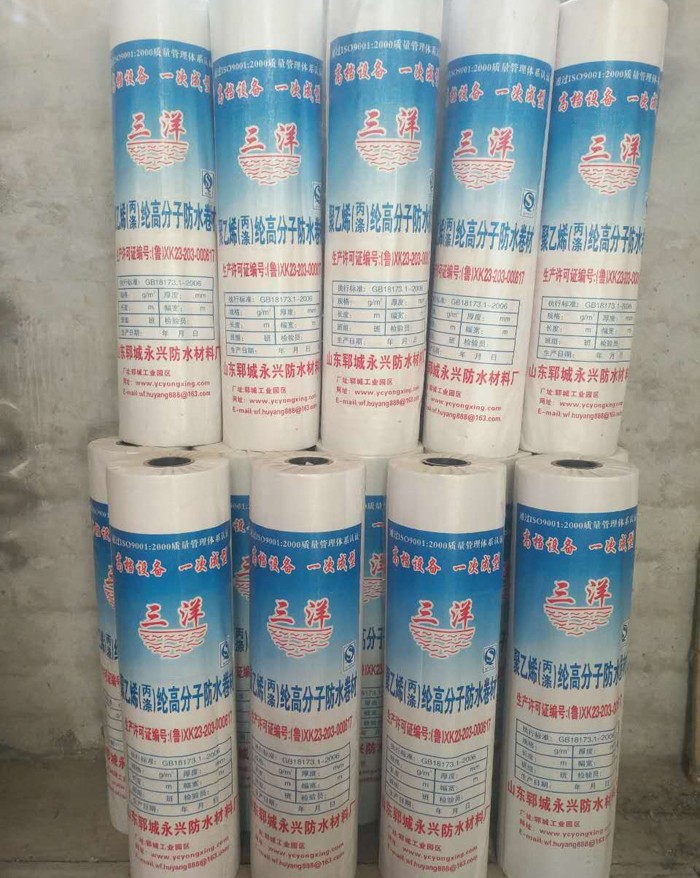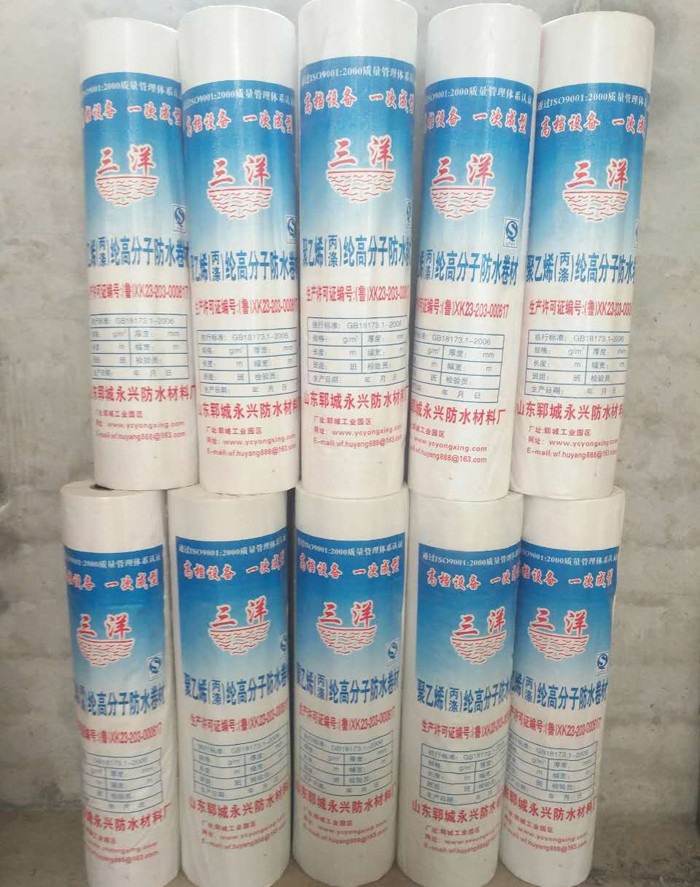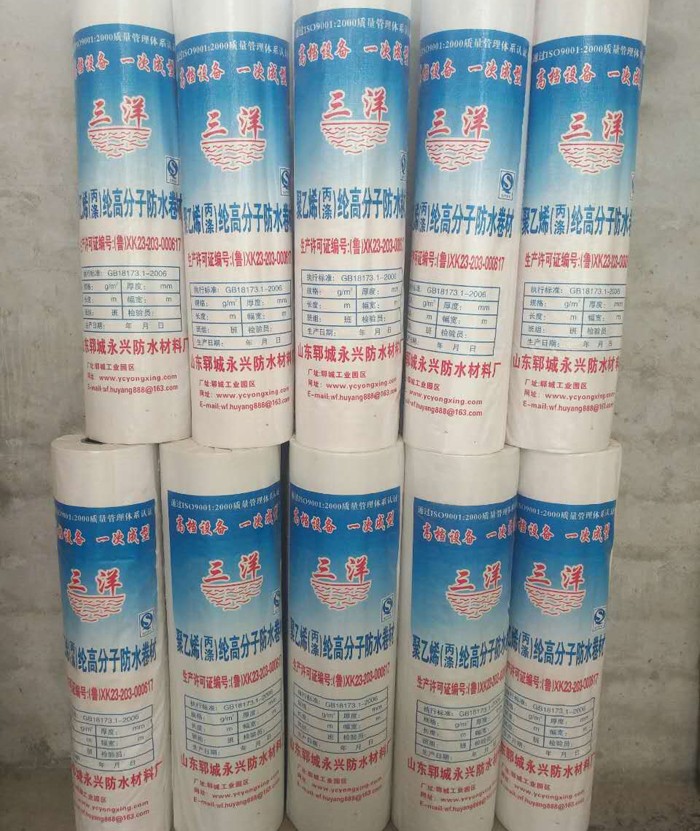 山东郓城永兴防水材料厂是集防水材料的研制开发、生产销售和防水施工于一体的专业化新型防水材生产企业。本厂生产的“三洋”牌聚乙烯丙(涤)纶复合防水卷材,具有性能优良,使用寿命长,适用范围广泛等特点,该产品广泛应用于屋面、地下室、卫生间、隧道、地铁、粮库、水利堤坝、池库、管道、矿井等各类建筑的防水、防渗、防潮,可直接在表面粘贴面砖、马赛克等装饰材料,是一种无毒、无污染的绿色新型防水材料。