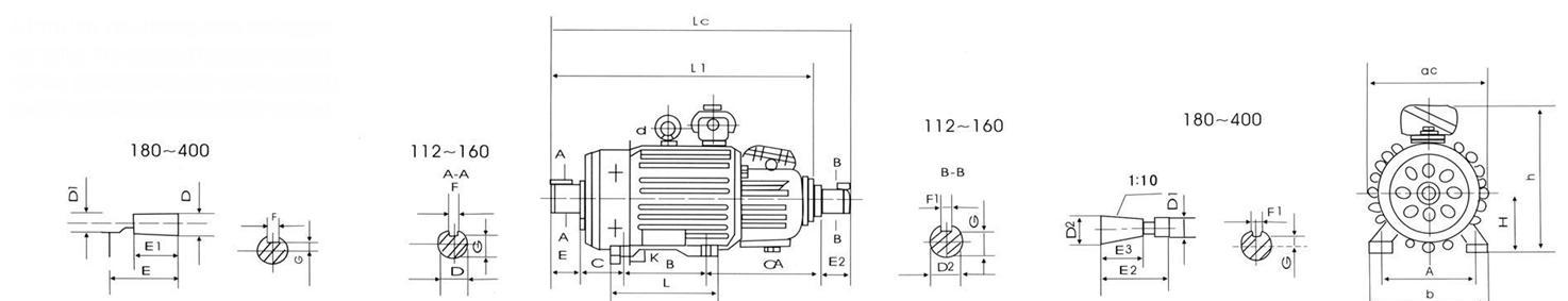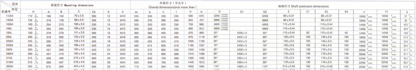 电动机的结构:绝缘等级:分为F级和H级两种。F级适用于冷却介质温度不超过40℃的一般场所;H级适用于冷却介质温度不超过60℃的冶金场所,两种电动机有相同的电气性能。 防护等级:冶金用为IP54;起重用为IP44。 冷却方法: 112~132为自然冷却(IC0041),160~355为自扇冷却(IC0141),400为具有内循环通风外扇冷却(IC0151)。 安装结构型式:见下表