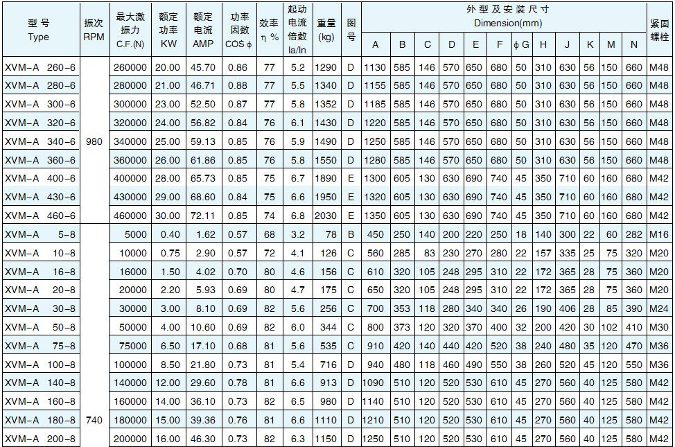 XVM-A振动电机的技术特点: ??1)此型号振动电机系采用VIMARC先进技术设计生产的振动电机。 ??2)先进的设计技术:所有参数的计算及其优化设计均由计算机工作站全面完成。精密的加工工艺、严格的质量体系,保证了振动电机工作状态下各部件配合、承力在范围内。 ??3)特殊的电磁设计:振动电机所需要配置的定、转子均采用具有**导磁性能的硅钢片,减少铁芯的涡流损耗,保证强大的起动力矩,可快速达到额定运转速度。 ??4)重载型轴承设计:所采用轴承均为重载型特制轴承,足以承受和传递径向激振力和轴向负荷,并有良好的散热能力。双重密封设计,保证在严重粉尘环境下的轴承室清洁。选用进口耐高温轴承锂基脂润滑油,延长轴承使用寿命。 ??5)无极调节:振动电机两端的激振块上标有刻度盘,可以容易的调节激振力及工作力矩从零的无极调节,满足工作需要。 XVM-A系列振动电机相关技术参数:
