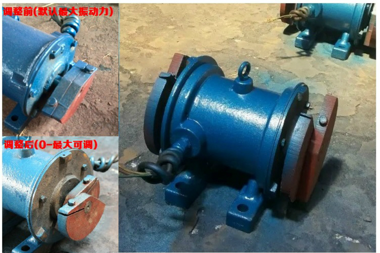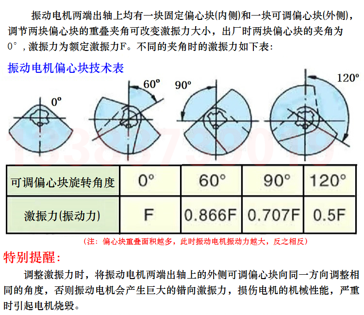 振动电机在使用过程中激振力过大或过小是生产上经常遇到的问题,我公司振动电机出厂之前,激振力均调至最大(即振动电机两端两块偏心块均完全重叠)。