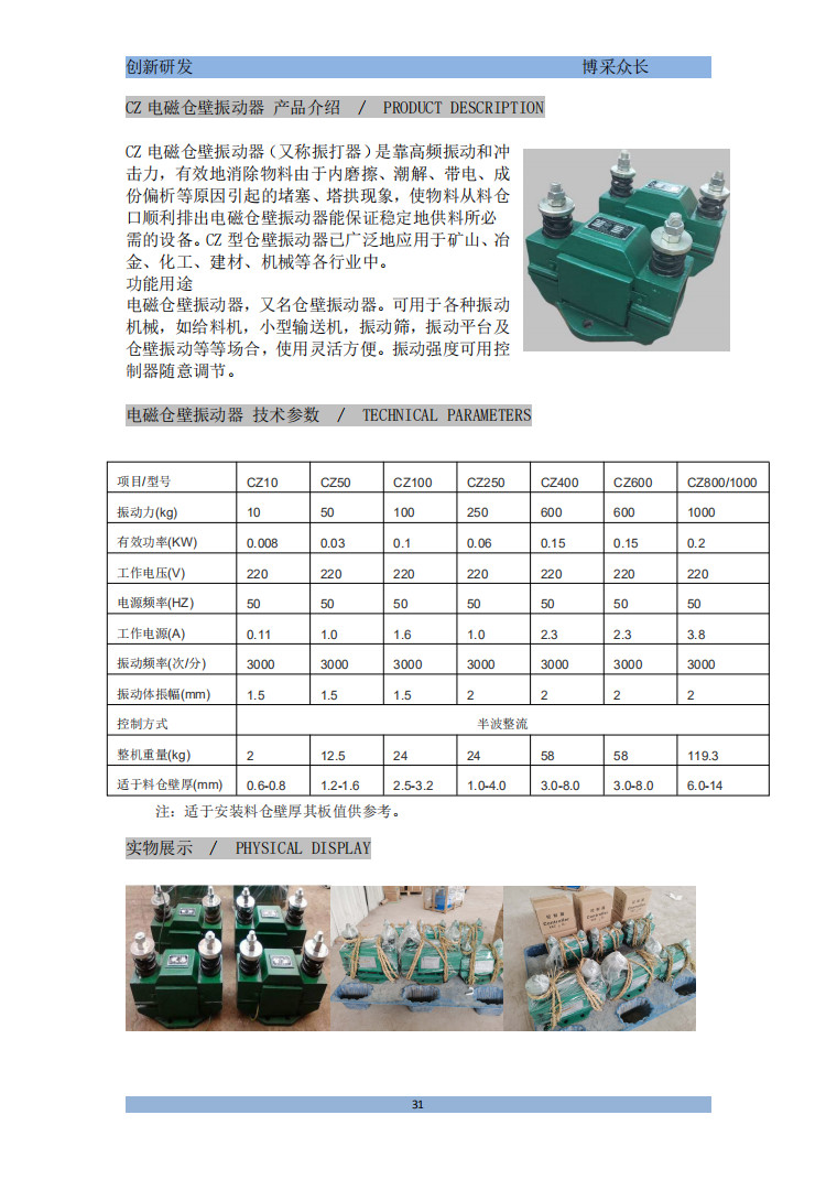 创博机械沈阳市仓壁振动电机 仓壁振动器czqcz电磁仓壁振动器价格仓壁振动器是靠高频振动和冲击力,有效地消除物料由于内磨擦、潮解、带电、成份偏析等原因引起的堵塞、塔拱现象,使物料从料仓口顺利排出。仓壁振动器是能保证稳定地供料所必需的设备。仓壁振动器的振动力和冲击力比较大,经常被作为物料的防闭塞装置使用,是一种节能通用型产品,被广泛使用在各行各业的出料仓的防闭塞装置。CZ电磁仓壁振动器(又称振打器)是靠高频振动和冲击力,有效地消除物料由于内磨擦、潮解、带电、成份偏析等原因引起的堵塞、塔拱现象,使物料从料仓口顺利排出电磁仓壁振动器能保证稳定地供料所必需的设备。CZ型仓壁振动器已广泛地应用于矿山、冶金、化工、建材、机械等各行业中。