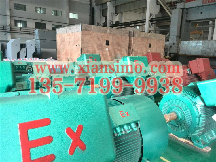 2.西玛牌高压防爆电机YB2系列高压隔爆型三相异步电机型号说明2.1电动机型号意义: Y:异步电机;B隔爆型;2改进设计序号;450轴中心高;2铁芯长度代号;2极数;W:环境代号(外。户外)2.2电动机防爆标志代表的意义: Ex:标志(防爆);d:电气设备防爆型式(隔爆型);ⅡB温度组别(T4);T4电气设备类别级别(Ⅱ类B级)3.西玛牌高压防爆电机YB2系列高压隔爆型三相异步电动机结构说明 该系列电动机采用国际流行的紧凑型结构,机座、端盖的内外表面均分布有散热筋,体积小巧,外形美观。 定子采用外装压结构,绝缘等级为F级,定子线圈采用带绝缘铜扁线绕制成型线圈,经绕包主绝缘并VPI整体浸漆后具有较高的电气强度、机械强度、绝缘性能、防潮性和热稳定性。 转子采用鼠笼结构,经高精度校验动平衡,电动机运转平稳,振动小。 根据不同的功率和转速轴承结构选型:H355~560-4、6、8P采用滚动轴承;H500~560-2P采用滑动轴承(根据GB3836.2-2000**性气体环境用电气设备第2部分:隔爆型“d”》的规定,滑动轴承电机不能做成ExdⅡCT4结构)。滚动轴承的电机两端轴承设不停机注排油装置,可定期补充润滑脂;滑动轴承为端盖式球面滑动轴承,采用压力供油润滑、油环自润滑或复合式润滑方式(由用户自由选择,如用户无特殊要求则为压力供油润滑),同时采取了防止轴电流产生的措施。 根据用户需要,电动机可安装轴承测温元件或仪表,监测轴承温度;也可根据用户需要设置定子测温元件、仪表及防冷凝加热装置。 电动机的隔爆结构采用圆筒型、平面型以及止口型等隔爆型式。4.西玛牌高压防爆电机YB2系列高压隔爆型三相异步电动机使用条件 4.1.电动机的使用环境条件: 4.1.1.海拔不超过1000m。 4.1.2.环境空气温度随季节变化,一般不超过40℃。 注:若电动机指定在海拔超过1000m或环境空气温度高于40℃的条件下使用时,应按GB755的规定。 4.1.3.**低环境空气温度,采用滚动轴承的电动机为-15℃,对采用滑动轴承的电动机为0℃。 4.1.4.环境空气**大相对湿度不超过95%(当温度为25℃时)(煤矿井下)或**湿月月平均**高相对湿度为90%,同时该月月平均**低温度不高于25℃(工厂)。 4.1.5.具有甲烷混合物及煤尘**危险的煤矿井下(非采掘工作面)及工厂具有引燃温度组别分别为T1~T4组的可燃性气体或蒸气与空气形成的**性混合物场所。 4.1.6.在无显着振动的地方。 4.1.7.在无破坏金属绝缘的气体和蒸气的环境。 4.1.8.有滴水的地方。 4.1.9.安装类别为Ⅲ类。 4.1.10.污染等级为3级。 4.1.11.派生产品(-W、TH、THW、TA、TAW、T、TW、WF1)适用的环境条件: YB2为基本型,适用于户内环境YB2-W适用于户外型环境YB2-TH适用于户内湿热带型环境YB2-THW适用于户外湿热带型环境YB2-TA适用于户内干热带型环境YB2-TAW适用于户外干热带型环境YB2-T适用于户内热带型环境YB2-TW适用于户外热带型环境YB2-WF1适用于户外中等腐蚀的环境4.2.电动机的使用电气条件: 4.2.1.额定频率:50Hz。 4.2.2.额定电压为3kV级(包括3kV、3.3kV、3.6kV)、6kV级(包括6kV、6.3kV、6.6kV)、10kV级(包括10kV、10.5kV、11kV)。 4.2.3.电动机的工作方式:S1(连续工作制)。 4.2.4.电动机的额定功率、额定电压、额定频率和定额见电动机铭牌上的数据。