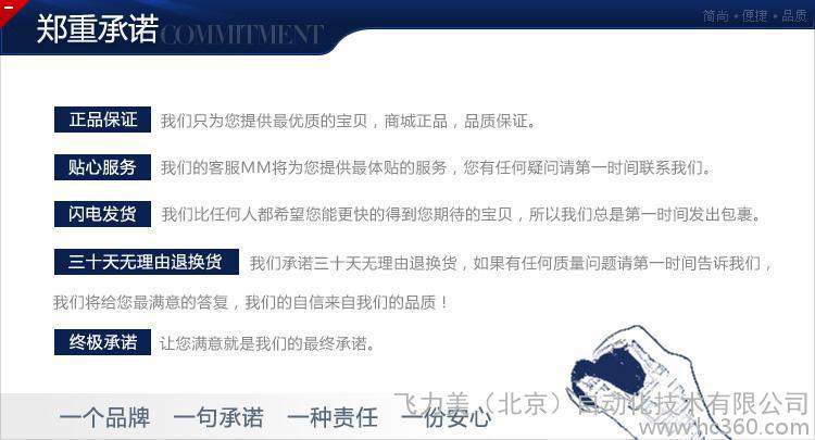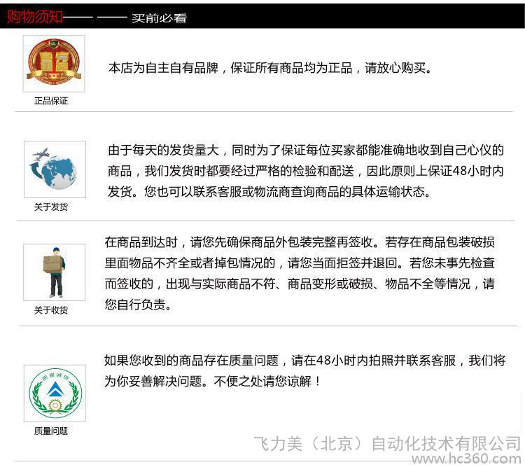 我司商城产品均为不含税价,需要开票的买家朋友,请联系在线的旺旺工作人员修改价格。税点按实际收取。签收说明:请 买家在收到快递包裹时不要急于签收,务必当即拆开包裹确认货物完好后再与快递派送员签收!一旦签收即被认为接受货物,代表确认货物正确完好,数量正确,恕 本店不再对货物承担任何责任。若发现货物有损坏,请立即拒绝签收并让派件员作出签字作证,退回包裹,我们会与快递公司协商赔偿事宜。所售出的商品无质量问 题,一律不退货;退换货说明:若 因质量问题须更换或退货的,买家需提供有问题宝贝的照片给卖家,不提供照片的本店有权力不提供退换货服务,所有退换的货品均不能有任何使用痕迹、损坏及影 响物品的再次销售的情形,须包装完好(以上要求是退换的关键,请亲爱的买家务必注意,收货后保留好外包装,保持产品自身包装的洁净,寄回时请添加单独的外 包装,以防快递运输中造成影响退换要求的情形发生,中国快递公司的运输过程非常不规范,请各位亲爱的买家一定要注意)请在2日内联系卖家,确认退回事宜; 并自行承担来回运费。飞力美(北京)自动化技术有限公司