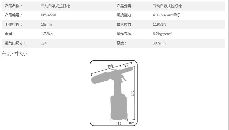 ▲零件均精密加工,精密度高,质量稳定;**新设计,扭力更大,性能更稳定,寿命更长;▲操作容易,轻松方便,噪音低,长时间工作不疲劳;▲适用于汽车、火车、船舶、航空业等钣金紧固连接结构行业;电脑机箱、电器机箱、厨柜等得拉拔紧固;铝合金门窗、室內裝潢等得紧固。气动拉钉枪??【名词解释】??气动拉钉枪:又名气动拉铆枪或气动拉钉机或气动铆钉枪或气动抽芯铆钉枪,叫法不一,是目前国内先进的铆接工具。??【气动拉钉枪工作原理】??气动拉铆枪以压缩空气为动力,通过各个汽缸的串联以达到拉断铆钉的目的,具有拉铆方便,铆接速度快、手持重量轻、无油液损耗等优点。??【气动拉钉枪的用途】??主要用于铝,铁,不锈钢板材的铆接。不锈钢/合金钢拉钉嘴。主要是汽动拉钉,枪拉钉速度快。油压式结构,拉钉力量大。气动拉铆枪广泛适用于装饰装潢、汽车制造及改装、集装箱、电器、家电、仪表、箱包和机械制造等行业,是目前国际**先进的铆接工具之一,目前国内适用量居多的气动拉钉枪品牌主要来自台湾、日本。??【气动拉钉枪适用范围】??1.铝门窗制造业??2.计算机外壳??3.电子制造业???4.其他各种铆接作业??【气动拉钉枪的功能】??一、振动技术提供了从工作环境改造学来说正确的动作,拉钉枪(积累性损伤障碍)的危险性降到**小化。特别针对1/4Magna-Lok结构铆钉、超过3700磅的牵引力、耐受力强的压铸结构以适用于粗糙不平的地方铆钉直径(mm):4.8/6.4(均适用各材质铆钉)**大工具拉伸力N(kgf**大行程(mm):22.0 所需气压MPa(kgf/cm):0.59-0.64(6.0-6.5)每根铆钉所需的空气量:4.6L/铆钉重量(kg):2.9 另外360度旋转气密接合可使工具在工作地点垂直放置?**适合用于被广泛使用的直径2.4到直么4.8的铆钉的铆接作业,长行程化(14-16mm)的设计,大幅扩大了一次性开机的铆接范围,而且速度较以往产品有所提高。??二、自动吸钉,拉钉速度比一般快一倍。自动退钉,连续拉钉作业,不必倒钉,即省时间。采用航空铝材料,轻巧,长时间使用无疲劳感。可调节拉力大小,速度快慢。液压装置无杂音,无后座力等。