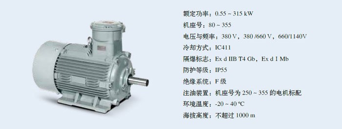 1MT0001 系列电动机防爆性能符合 GB3836.1-2010**性气体环境用电气设备第 1 部分:通用要求》和 GB3836.2-2010**性气体环境用电气设备第 2 部分:隔爆型“d”》的规定,防爆标志为 Ex d IIB T4 Gb,适用于有**性气体混合物存在的场所:- Ex d IIA T4 Gb、Ex d IIB T4 Gb 分别适用于工厂用 II 类 A 级及 B 级,温度组别为 T1、T2、T3 和 T4 组**性气体混合物存在的环境。