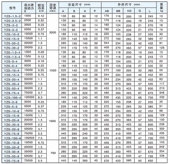 YZS系列振动电机技术参数: