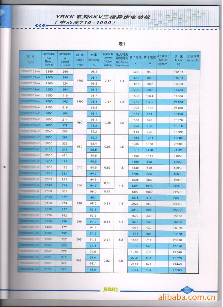一、概述 YRKK系列6kV(710-800)高压三相异步电动机为饶线型转子异步电动机。该电动机的防护等级为IP44/IP54,冷却方法为IC611。 本系列电动机具有高效、节能、噪声低、振动小、重量轻、性能可靠、安装维修方便等优点。 本系列电动机可作驱动各种不同机械之用。如通风机、压缩机、水泵、破碎机、切削机床及其它设备,并可供煤矿、机械工业、发电厂及各种工矿企业作原动机之用。 本系列电动机结构及安装型式为IMB3,定额是以连续工作制(S1)为基准的连续定额,电动机的额定频率为50Hz,额定电压为6kV,其它电压等级或特殊要求,在订货时可与用户共同商订。 二、型号含义 YRKK7101–4:“YRKK”表示封闭带空-空冷却器绕线型转子异步电动机;“7101”表示机座中心高710mm,1号铁心长;“4”表示极数。 三、订货须知(用户订货时须注明如下要求) 电机型号(YRKK7101–4额定功率(2240kW)、额定电压(6000V)、额定频率(50Hz)、同步转速(1500r/min)、安装方式(1MB3)、防护等级(1P44)、冷却方法(IC611)、绝缘等级(F级)、环境条件(海拔1000m,环境温度40℃)。 注:2、4极电机禁止用皮带轮传动;其它极数若用户需要用皮带轮传动,事先应与制造厂协商。