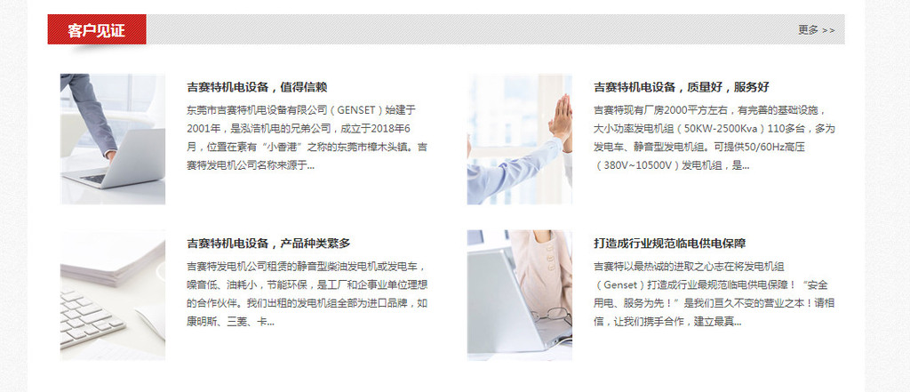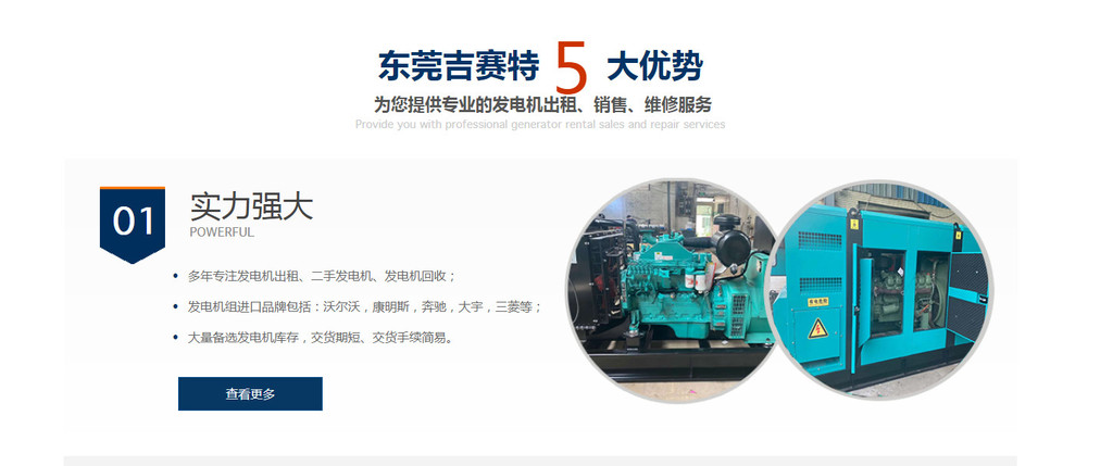 东莞市吉赛特机电设备有限公司(GENSET)始建于2001年,是泓浩机电的兄弟公司,成立于2018年6月,位置在素有“小香港”之称的东莞市樟木头镇。吉赛特发电机公司名称来源于“GENSET”英文谐音,意思是发电机组的意思。这代表着吉赛特发电机从成立之初即致力于发电机组出租(租赁)、销售、维修、保养、二手回收买卖、原厂配件供应等相关事业。吉赛特专注于发电机组行业十余年,经验丰富,已为工厂、油田矿山、酒店、房产、军 工、高速公路、铁路、交通、水利建设、邮电通信、医院、银行、机场等行业数百家公司单位服务,以强硬的技术和至诚的服务理念赢得了强烈的认可和赞扬!