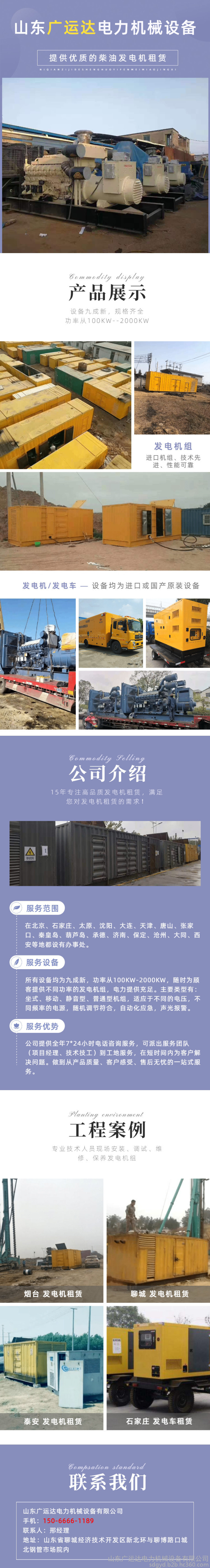 山东广运达电力机械设备有限公司向客户提供**的柴油发电机组和发电车租赁,所有设备均为九成新。规格齐全,功率从100KW--2000KW随时为顾客提供不同功率的发电机组,电力提供充足,为各项工程、大型工厂、酒店、超市临时救急用电之选。主要类型有:坐式、移动、静音型、普通型机组,适应于不同的电压,不同频率的电源,随机调节符合,自动化应急,声光报警。专业技术人员现场安装、调试、维修、保养发电机组,根据用户需要提供24小时发电服务。