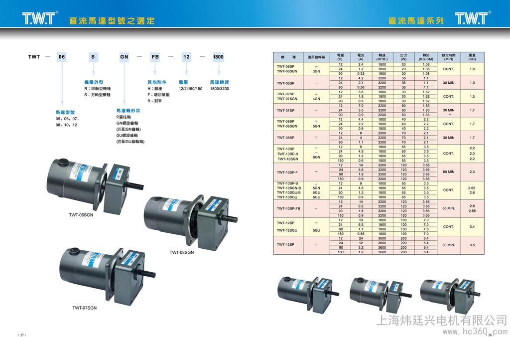 TWT东炜庭永磁直流马达,直流刹车电机/马达产品通过了ISO、3C、CE认证。东炜庭永磁直流马达,直流刹车电机/马达具有低噪音、高扭力、体积小、重量轻、寿命长、免保养等特点。东炜庭刹车电机/马达群涵盖电子、医疗设备、印刷机械、包装机械等制造业。东炜庭永磁直流电机输出功率有20W30W40W65W100W,电压12V/24V/90V/180V,减速比1**转速4rpm.