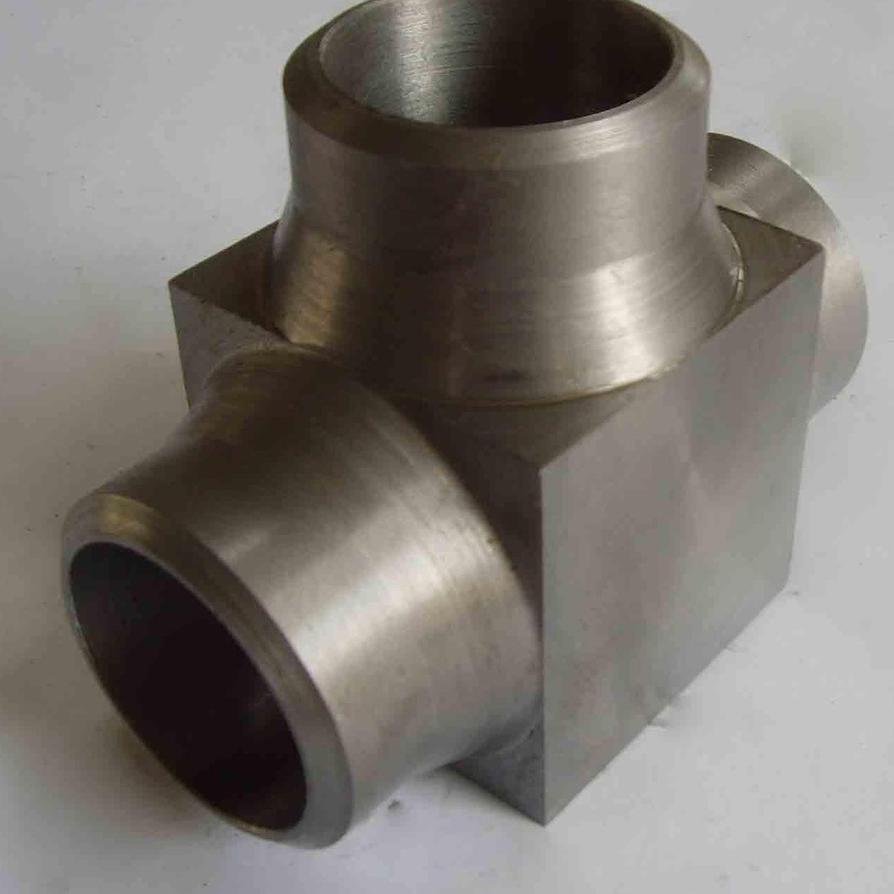 1.液压胀形三通的液压胀形是通过金属材料的轴向补偿胀出支管的一种成形工艺。其过程是采用专用液压机,将与三通直径相等的管坯内注入液体,通过液压机的两个水平侧缸同步对中运动挤压管坯,管坯受挤压后体积变小,管坯内的液体随管坯体积变小而压力升高,当达到三通支管胀出所需要的压力时,金属材料在侧缸和管坯内液体压力的双重作用下沿模具内腔流动而胀出支管。三通的液压胀形工艺可一次成形,生产效率较高;三通的主管及肩部壁厚均有增加。因无缝三通的液压胀形工艺所需的设备吨位较大,目前国内主要用于小于DN400的标准壁厚三通的制造。其适用的成形材料为冷作硬化倾向相对较低的低碳钢、低合金钢、不锈钢,包括一些有色金属材料,如铜、铝、钛等。