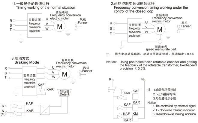 若对电机极数、电压等级、调速特性、绝缘等级、防护形式、安装尺寸等有特殊要求。以及带制动、闭环控制等、请在订货时说明,另行协商。
