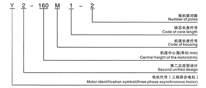 型号含义:如Y2-200L2-6E:“Y2”表示异步电动机第二次改型设计,“200”表示中心高,“L”表示机座长短号,“2”表示铁心长度序号,“6”表示极数,“E”表示第二种设计。