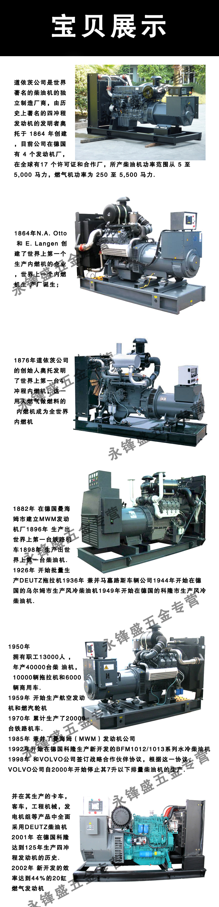 德国道依茨(DEUTZ)公司创建于1864年,是世界上**台四冲程内燃机的生产厂。1985年,道依茨公司和曼海姆公司合并**终成为现在的道依茨集团公司,生产柴油发动机功率范围由4KW至3700KW,包括风冷、油冷、水冷柴油机及燃气发动机,具有体积小、功率大、噪音低、排放好、冷启动容易等特点,能满足当今世界苛刻的排放法规,其风冷柴油机是世界上同类型中的**产品。