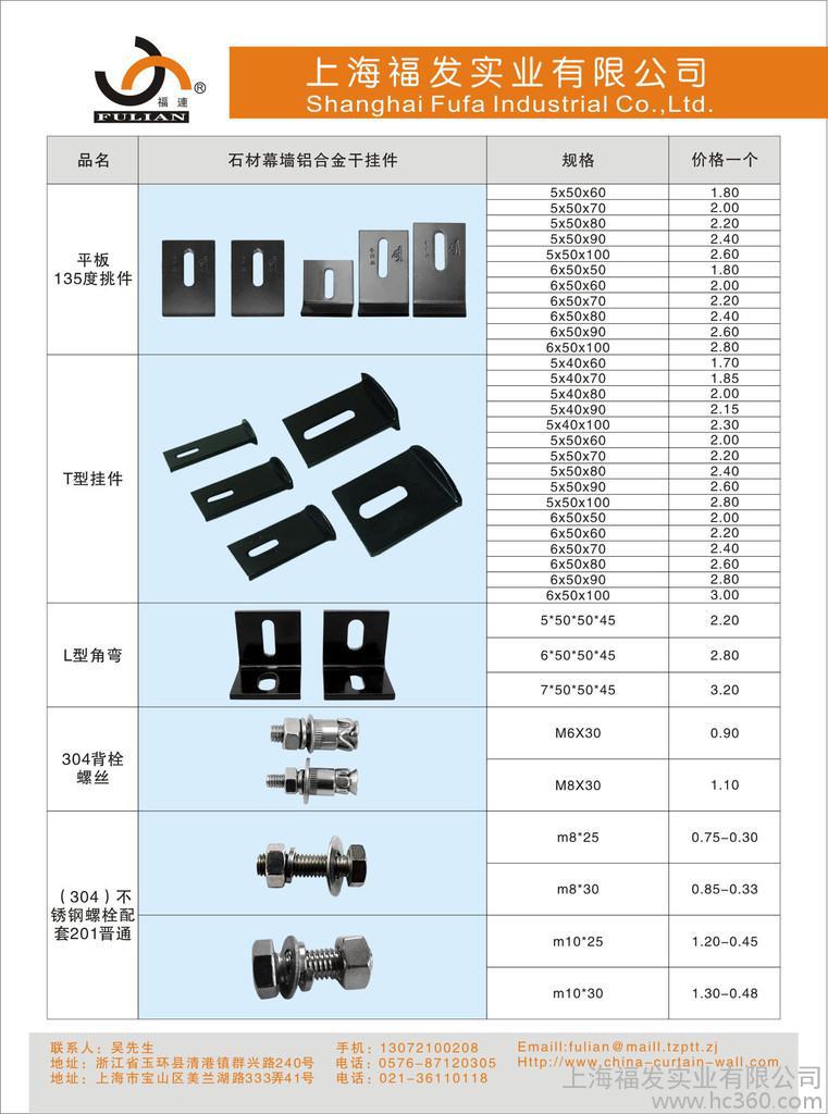 主要产品有:建筑幕墙五金零配件,石材幕墙干挂件,SS316-SS304不锈钢挂件,铜镁铝合金T型挂件,6063-T5字母干挂件,6063-T5背栓干挂件,6063-T5 SE组合干挂件,6063-T5 SE型干挂件,陶瓷板挂件等所有产品均可以来料加工,来样生产。