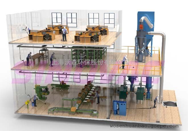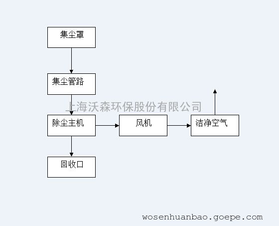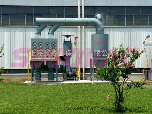 2、系统的工作原理 集尘系统运行时,飞扬的粉尘通过集尘罩被有效的吸入到真空管网内部,在真空负压的作用下,被吸进的粉尘随气流沿着负压管路被抽入集尘器内部。首先大颗粒粉尘经过进旋风除尘器,在旋风及离心力的作用下,落入机器下方的集尘桶内;细微粉尘随气流继续向上运动。粉尘进入滤筒主机过滤室时,被过滤器分离,清洁的空气由集尘主机排风出口经消音装置排入空气中。过滤器上粉尘通过系统自动脉冲反吹装置定时反吹交替工作来完成。