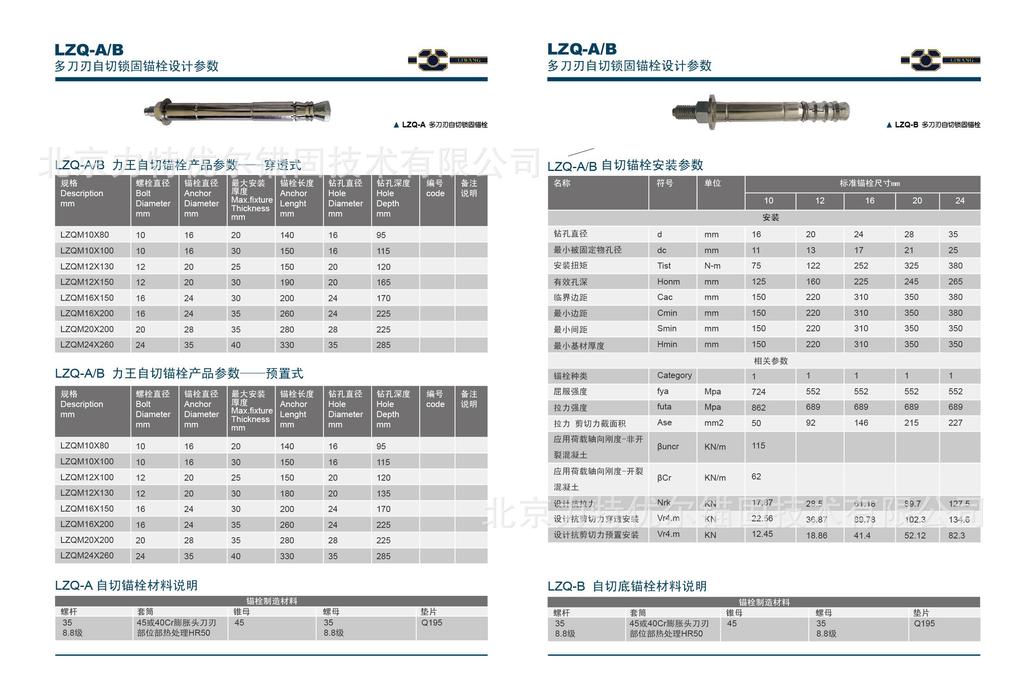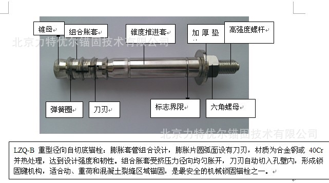 (2)多刀刃自切锁固锚栓广泛适用于各种重型设备、管道悬挂支架、隧道照明系统、结构加固等领域,其产品具有锚固强度高、抗剪切力、各种动、重荷载工作环境、没有膨胀应力、小边距、安全可靠等优点。可按客户需求设计加工各种结构,欢迎采购商咨询和选用!