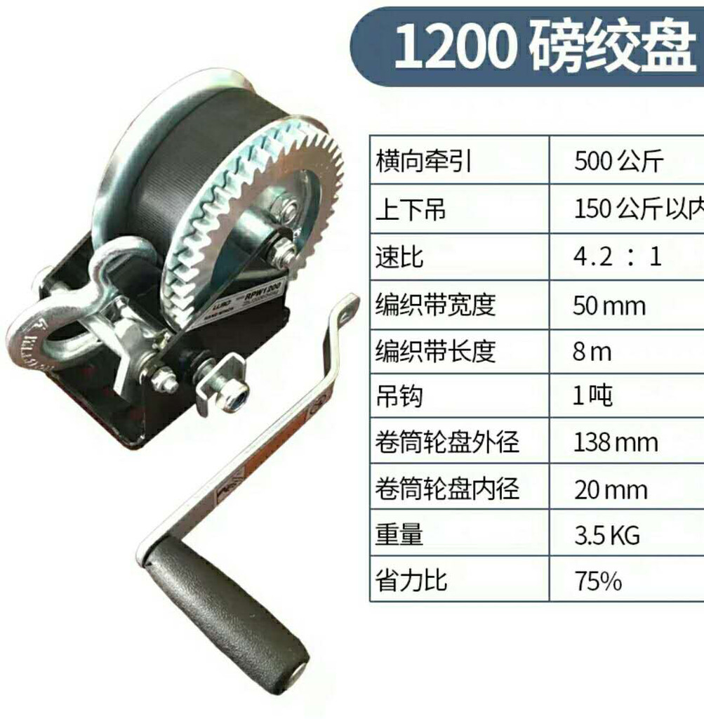 手摇绞盘是什么:手摇绞盘是一种自带自动卡锁扣的手动绞盘,有些地方也叫作刹车绞盘。手摇绞盘是一种机械用具,因其具滑轮组工作原理,可以将重物提起,所以广泛用于货物的装卸.