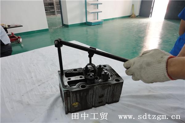 》拆装时,用螺钉将固定板固定在缸盖上,将弹簧压缩板套入螺杆,使弹簧压缩板的缺口处套在推杆上,压缩板则压缩弹簧,调节螺母,利用螺纹互锁力将弹簧压缩,利用起子或尖嘴钳拆下卡圈,取下压缩器,即可拆卸弹簧;
