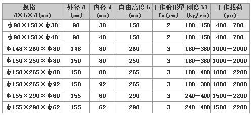 复合弹簧是由金属螺旋弹簧和橡胶复合在一起的园筒状弹性体。该产品优于金属弹簧,具有抗腐蚀性好、寿命长等优点,与其它弹簧相比,减振能力强,缓冲效果好。具体的复合弹簧规格见下表。