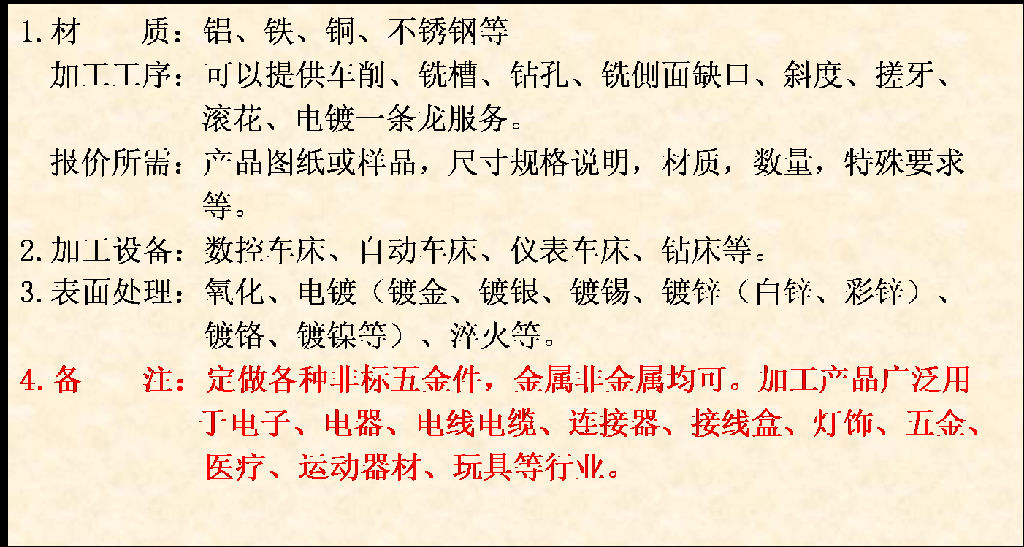 公司可来图定制、加工各种自动车床件、数控车床件。如:螺丝,螺母,弹簧,五金端子,光伏连接器保险丝端子,连接轴等五金制品。能加工的材质包括不锈钢、铜、铁、铝及各种钢材,可以提供车削、铣槽、钻孔、铣側面缺口、斜度、搓牙、滚花、电镀一条龙服务。产品广泛用于电子、电器、电线电缆、光伏连接器、接线盒、灯饰、五金、医疗、运动器材、玩具等行业。