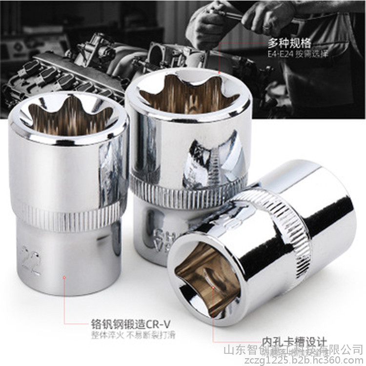 性能特点:规格:1/4"E4-5-6-7-8MM; 3/8"E10-11-12-14-16MM ;1/2"E18-20-22-24MM;材质:材质:合金45钢;整体热处理,高硬度,不易打滑。 采用铬钒钢材质生产,耐用防锈,操作方便。