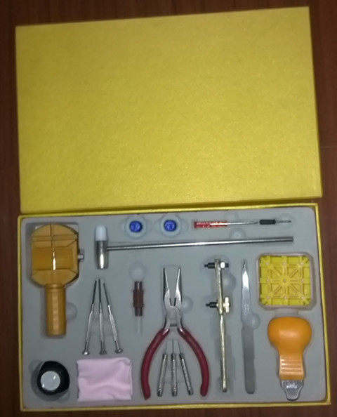组合工具:拆带器,放大镜,擦表布,螺丝批,尖嘴钳,冲针,二爪开,锤子,底盖刀,镊子,拆带座。。。。。。