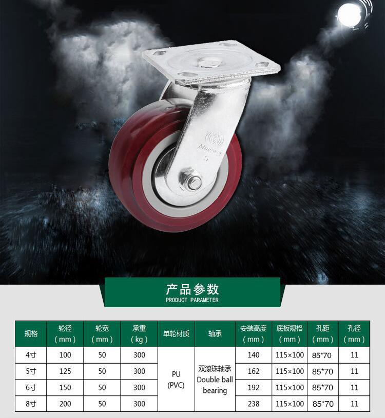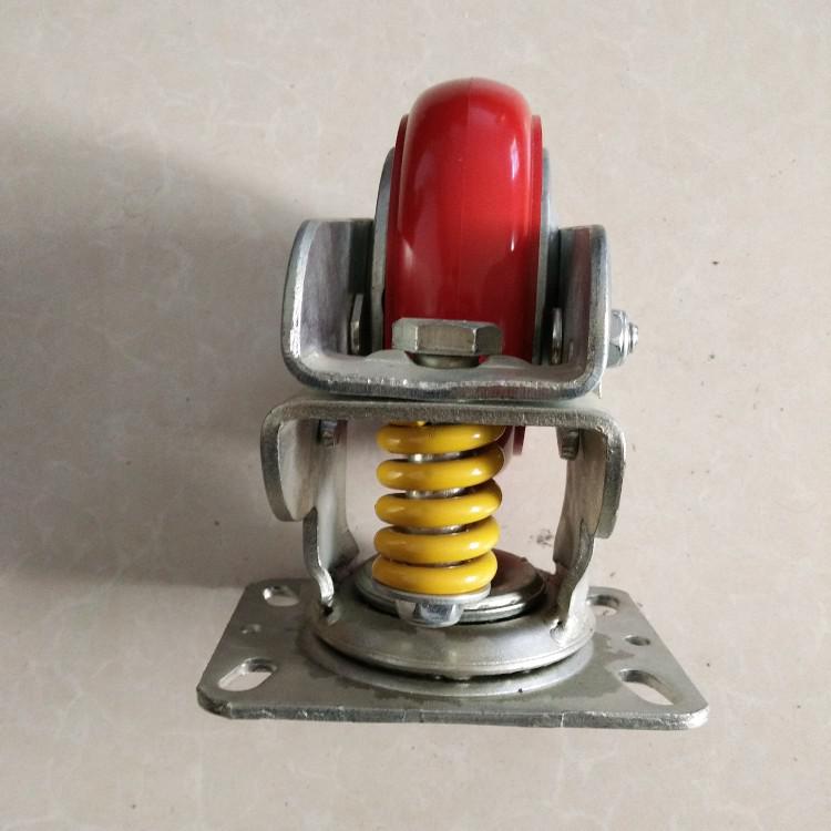 ●减震轮结构设计合理,选用优异的耐冲击抗震弹簧,避免轮子在凹凸地面上工作时因受震动而损坏。