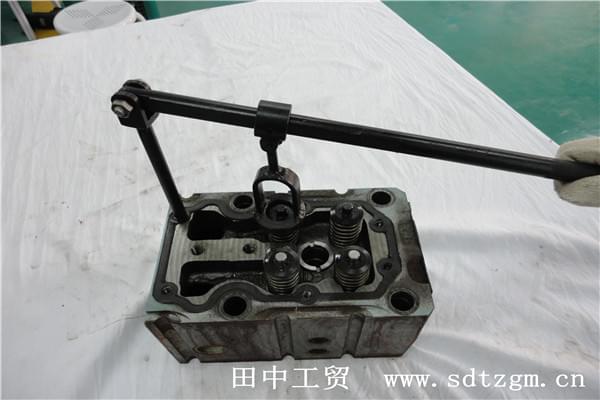 》拆装时,用螺钉将固定板固定在缸盖上,将弹簧压缩板套入螺杆,使弹簧压缩板的缺口处套在推杆上,压缩板则压缩弹簧,调节螺母,利用螺纹互锁力将弹簧压缩,利用起子或尖嘴钳拆下卡圈,取下压缩器,即可拆卸弹簧;
