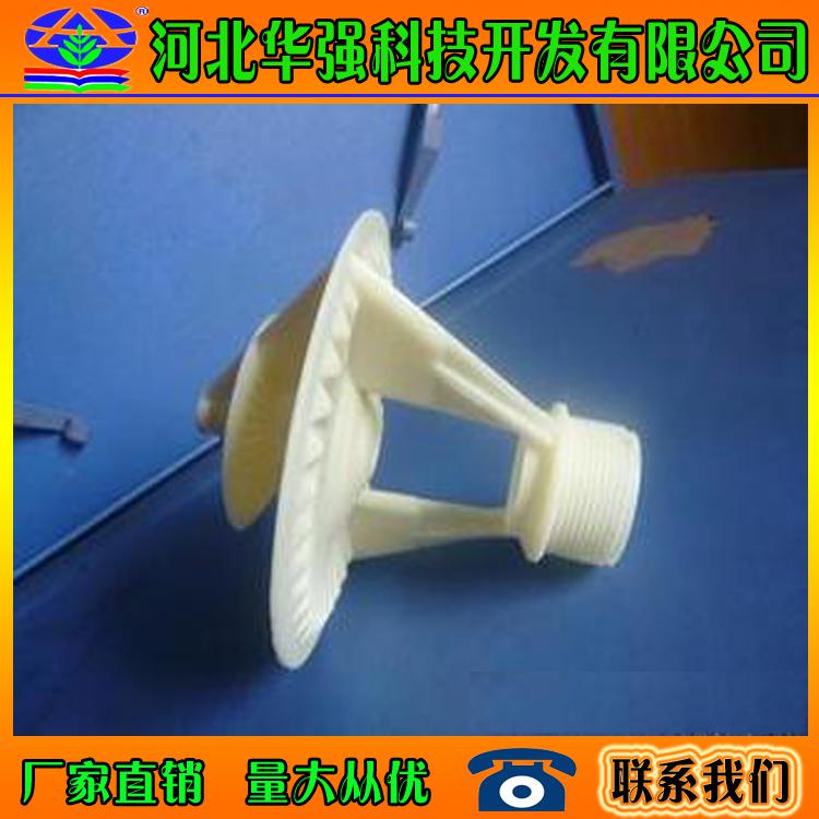 冷却塔用喷溅装置是一种三溅式喷头。具有与配水管相连的承插式 瓶形接口和锥形管嘴,在锥形管嘴的下部还依次同轴间隔设置有外径依次变小的大溅水盘、小溅水盘和锥形辟水头;并且由至少两支圆周排列立式设置的连杆固定在承插式瓶形接口上,在大溅水盘和小溅水盘上还分别设置有与锥形管嘴同轴且与锥形管嘴下口内径相比内径依次变小的大漏水孔和小漏水孔,大溅水盘和小溅水盘为弧面朝上的半球形,锥形辟水头为锥角向上的锥形。