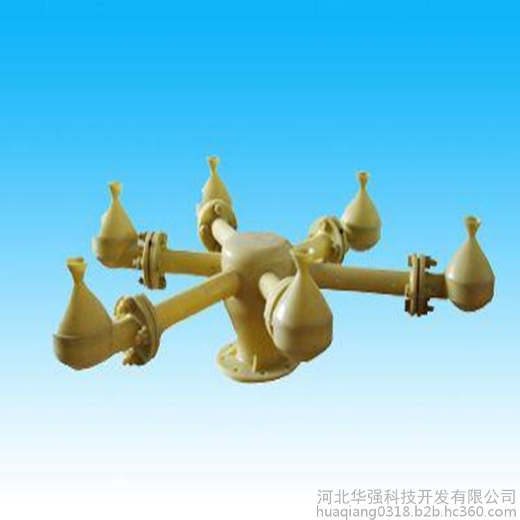 冷却塔用喷头装置的工作原理是:压力水沿切向水平进入蜗型喷头,在腔体内旋转并向下作回旋运动,从下方喷嘴喷出。水喷出后形成一伞状旋转水体,冲击溅水条及溅水叶片,溅散成均匀分布雾状细小水滴,下落到填料顶面。