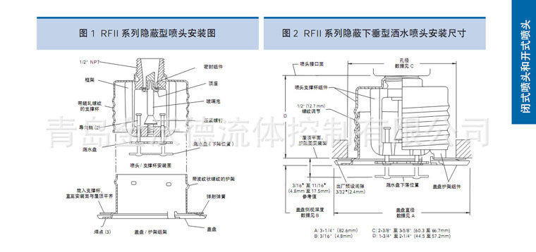??RFII 系列快速响应 (3mm 玻璃泡 ) 和标准响应 (5mm 玻璃泡 )、K=80 隐蔽下垂型喷头,具有隐蔽型喷头的平盖盘,使喷头具有装饰性。该喷头是建筑敏感性区域的选择,如旅馆的门廊、办公楼、教堂和饭店等。