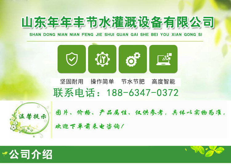 山东年年丰节水灌溉设备有限公司是集滴灌、滴灌管、滴灌带、滴灌设备、节水灌溉设备、喷灌、微喷、微喷带、微灌、涌泉灌、PE/PVC塑料管材管件、过滤器、施肥器及水肥等节水灌溉设备研制、开发、生产、经营、技术服务于一体的节水灌溉公司。公司坚持“用质量推动企业发展”为发展宗旨,不断以百分的投入缔造高质量的产品和价值,通过了ISO9001质量/环境管理体系认证,并按照标准进行生产,开发并生产出更多、更适用、更经济的节水产品。 公司坚持以人为本的经营理念,开拓创新,以推广适合国情的节水灌溉设备和技术为宗旨。目前公司主要生产的产品有:喷灌带、滴灌带、滴灌管以及各种配套设施。该产品采用塑料材质制造,制造精度高,洞孔能防止堵塞、出水量均匀、性能强、轻质、抗冻、产品坚韧耐用等优点,深受广大用户青睐。该产品广泛适用到蔬菜、香蕉、荔枝、西瓜、棉花、烟草、花卉、食用菌、小麦、玉米、土豆等一切农用经济作物。可以节约工作量,利用水资源紧缺,提高农作物产量,增加经济效益。