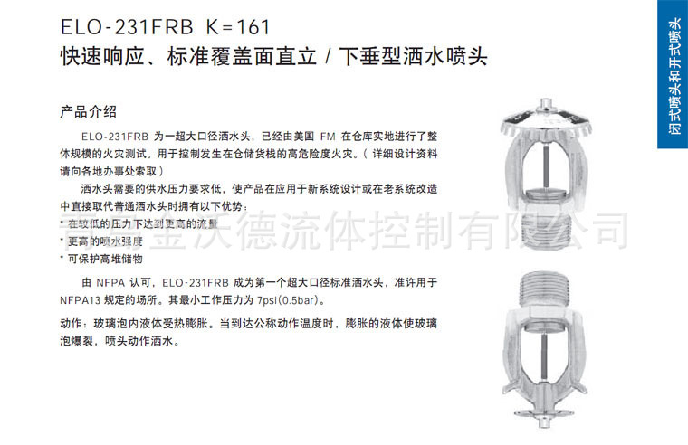 ?ELO-231FRB 为一超大口径洒水头,已经由美国 FM 在仓库实地进行了整体规模的火灾测试。用于控制发生在仓储货栈的高危险度火灾。