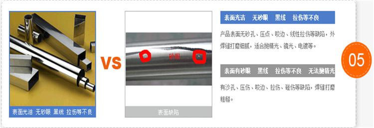 我司的不锈钢管全部采用一级正材不锈钢板材制造,特色在于:无砂眼,无砂孔,无黑点,无裂缝,可抛光电镀,焊道平整,可套管。压扁、扩口、冲孔、攻牙、拉伸、折弯,切割,焊接加工性能优势,镍含量稳定,产品符合中国GB、美国ASTM、日本JIS等规范!