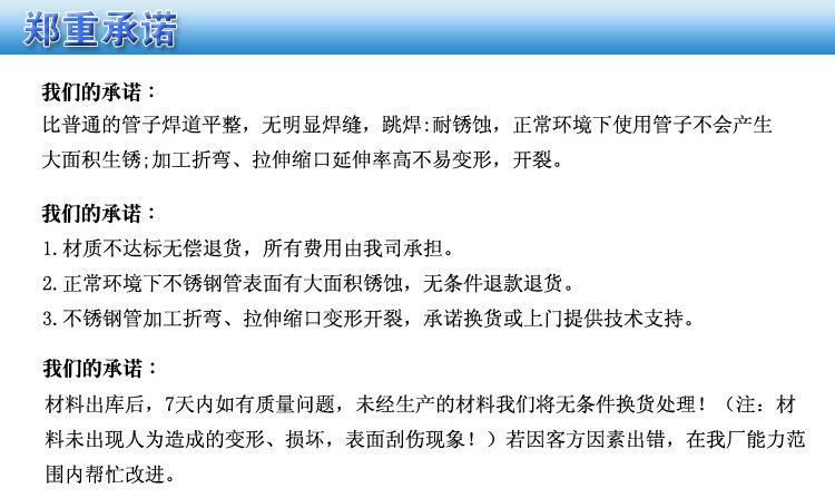 1、我司的不锈钢管出厂都是逐支严格检验挑选的,出厂的都是精品,不像市场某些厂家那样,穿孔的,焊不好的也混在里面卖给客户,这样显得价格低,但是实际上,客户的成本更高!
