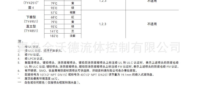 ??TY-B 系列直立 / 下垂型洒水喷头 (K=40,80,115),是标准响应 - 标准覆盖面装饰性喷头,玻璃泡直径 5mm,用于轻、中、严重危险级场所、商用场所。( 如银行、旅馆、购物中心 )。精炼厂、化工厂和其它各类公厂。