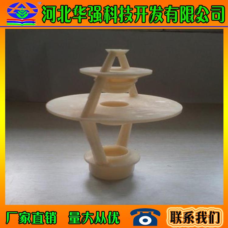 冷却塔用喷溅装置是一种三溅式喷头。具有与配水管相连的承插式 瓶形接口和锥形管嘴,在锥形管嘴的下部还依次同轴间隔设置有外径依次变小的大溅水盘、小溅水盘和锥形辟水头;并且由至少两支圆周排列立式设置的连杆固定在承插式瓶形接口上,在大溅水盘和小溅水盘上还分别设置有与锥形管嘴同轴且与锥形管嘴下口内径相比内径依次变小的大漏水孔和小漏水孔,大溅水盘和小溅水盘为弧面朝上的半球形,锥形辟水头为锥角向上的锥形。