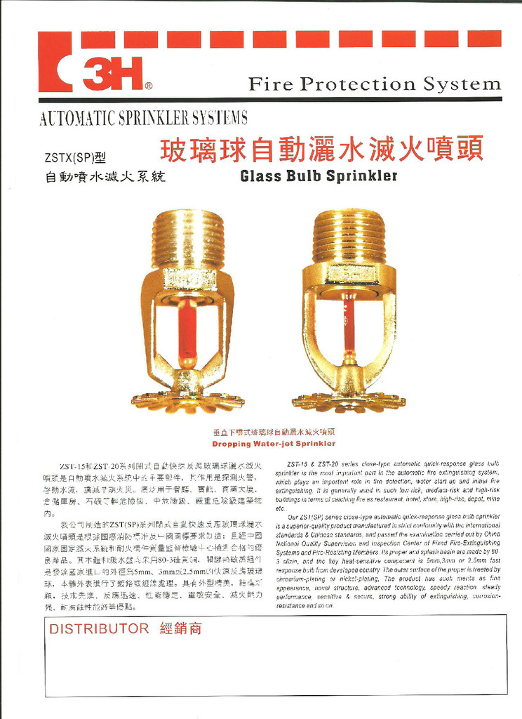 我公司製造的ZST(SP)系列閉式自動快速反應玻璃球灑水滅火噴頭是根據國際消防標準及中國國標要求製造;且經中國國家固定滅火系統和耐火構件質量監督檢驗中心檢測合格的優良産品。其本體和濺水盤均采用80-3矽黃銅,關鍵熱敏感元件是德國進口,本體外表進行了鍍鉻或鍍鎳處理。具有外型精美,結構新穎,技術先進、反應迅速、性能穩定、靈敏安全、滅火能力强、耐腐蝕性能好等優點。