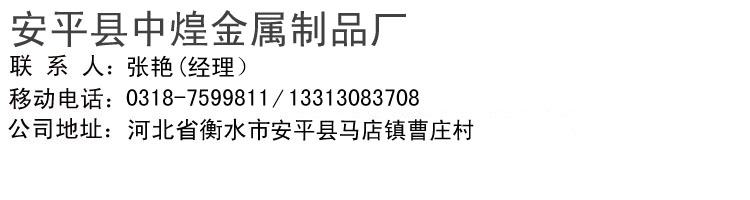 安平县中煌金属制品厂,是专业生产金属丝,金属网系列的厂家,月生产金属丝2000余吨,金属网1000吨,从业人员200余人。厂内设有拔丝、镀锌、焊接、编织、加工、质检等车间,生产工艺先进,产品检测设备完善,技术力量雄厚,产品经省质检部门鉴定完全符合国家质量标准,