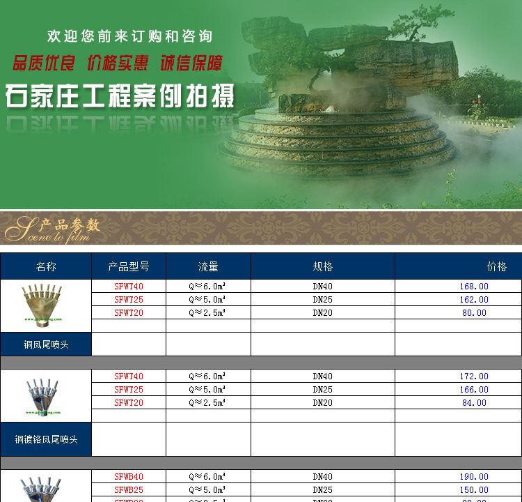 **黄铜、铜镀铬、不锈钢喷泉喷头,水下灯具,控制设备,异形管道制作。音乐喷泉、跑泉、程控喷泉、旱喷、光纤水帘等喷泉项目的设计施工。玻光喷泉、跳泉成套设备的销售与安装。冷雾喷泉、加湿降温、除臭消毒设备材料销售、设计与安装。水下灯、地埋灯、园林灯等园林照明销售安装。专业泳池设备销售以及专业游泳池设计施工。球场、园林、农业喷灌、微喷、滴灌材料的销售、设计与施工。园林草坪机、进口园林工具等销售购买须知 怡成喷泉景观设备有限公司欢迎您