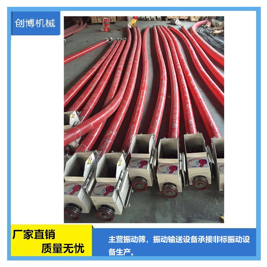 创博机械3.5寸吸粮机拜泉县车载软管吸粮机 自动上料机提升机 螺旋绞龙输送机 弹簧叶片吸粮管价格本机有体积小、功率大、使用方便等特点,机器使用电源220V(两相电可操作)380V,机身长度3-25米,每小时抽粮5-25吨,适合下乡抽粮/倒垛/装仓/装袋等使用,能使您减轻人工负担。省工省时省力,堪称抽粮神器。台交易,现在也是比较流行的。亦可以用在养殖场,饲料厂、食品厂、塑料厂等输送颗料的。本机可直接卡在货车箱的加高壁上**可以了,可弯曲可,携带方便,是各种粮食作物装车、卸车、出库、入库等的好设备,即省工又省力,本厂还生产其他机械设备,有需要和我联系。 水平距离 -6-20米 工作时软管弯曲半径不得小于一米。