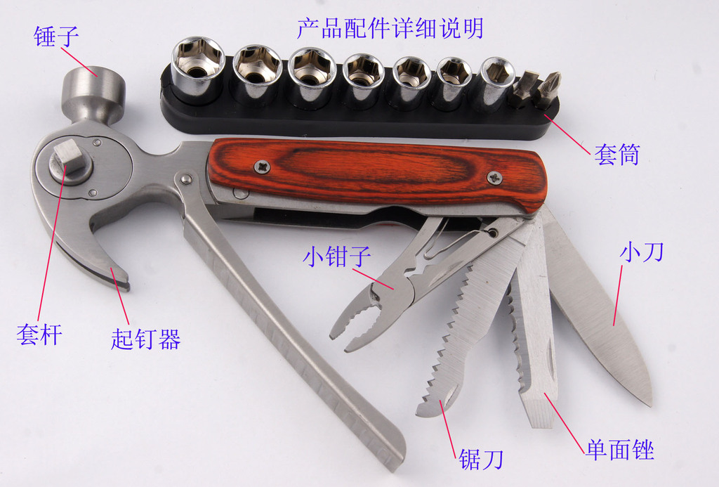 【功能】:锤、起钉器、剪刀、刀、一字螺丝刀、十字螺丝刀、锉刀、锯刀 、套筒