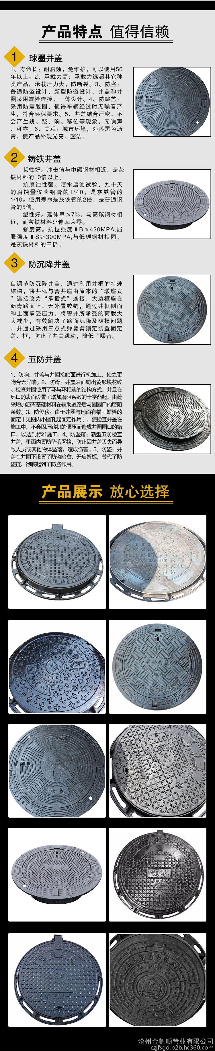 井盖本身的防盗措施,我们生产的井盖本身可以加一个金属的表链,从内部**可以把井圈和井盖连为一体,主要的防盗措施还是我们安装的弹簧弹簧的井盖,装完以后会自动起到一个防护的作用,不用专门的工具是打不开井盖的,这种卡簧**是我们防盗的措施之一。铸铁井圈井盖被晶间腐蚀:这种不含钛和铌的材料有晶间腐蚀的倾向。加入钛和铌,再配以稳定处理,可以减少晶间腐蚀。在空气中或化学腐蚀介质中能够抵抗腐蚀的一种高合金钢。现在井盖的种类非常多,可以根据制作质料、尺寸巨细和厚度等来进行区分,别的还可以结合路面现实环境来计规定做,在购置产物时,另有许多图案可供选择,人们可以选用表面精致符合安置环境的盖子来进行牢固。铸铁井盖铸铁的过热和高温静置的影响