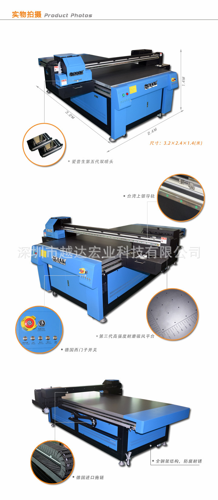 增加了介质自动检测装置,喷头高度自动控制系统能够自动探测打印介质的厚度,(不超过100mm),并将喷头的高度自动调节到用户的设备高度,实现在各种材质的完美打印。